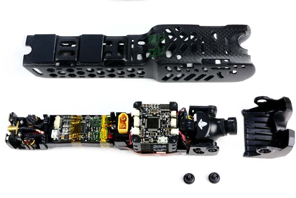 The entire FPV racer is built around the idea of countless self-contained parts working together hand in hand for a unified user experience. Starting from the TBS ZeroZero FPV camera, to the TBS POWERCUBE and TBS CORE PRO, everything is repairable without a soldering iron, and with just two tools. This does not prevent you from configuring all tuning parameters via the built-in OSD, to changing VTx channels or power levels.